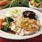 Over harissa yogurt, feta cheese, fattoush salad with tahini pomegranate vinaigrette, organic chickpea hummus, naan bread.