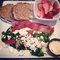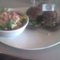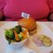 Roasted Brussels sprouts, asparagus, cremini mushrooms, red pepper, arugula, pecans and pesto sauce with a side pineapple citrus salad (instead of fries and coleslaw).