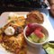 In house roasted tomato, goat cheese, pesto, tahini harissa yogurt, arugula, side pineapple citrus salad (instead of fries).